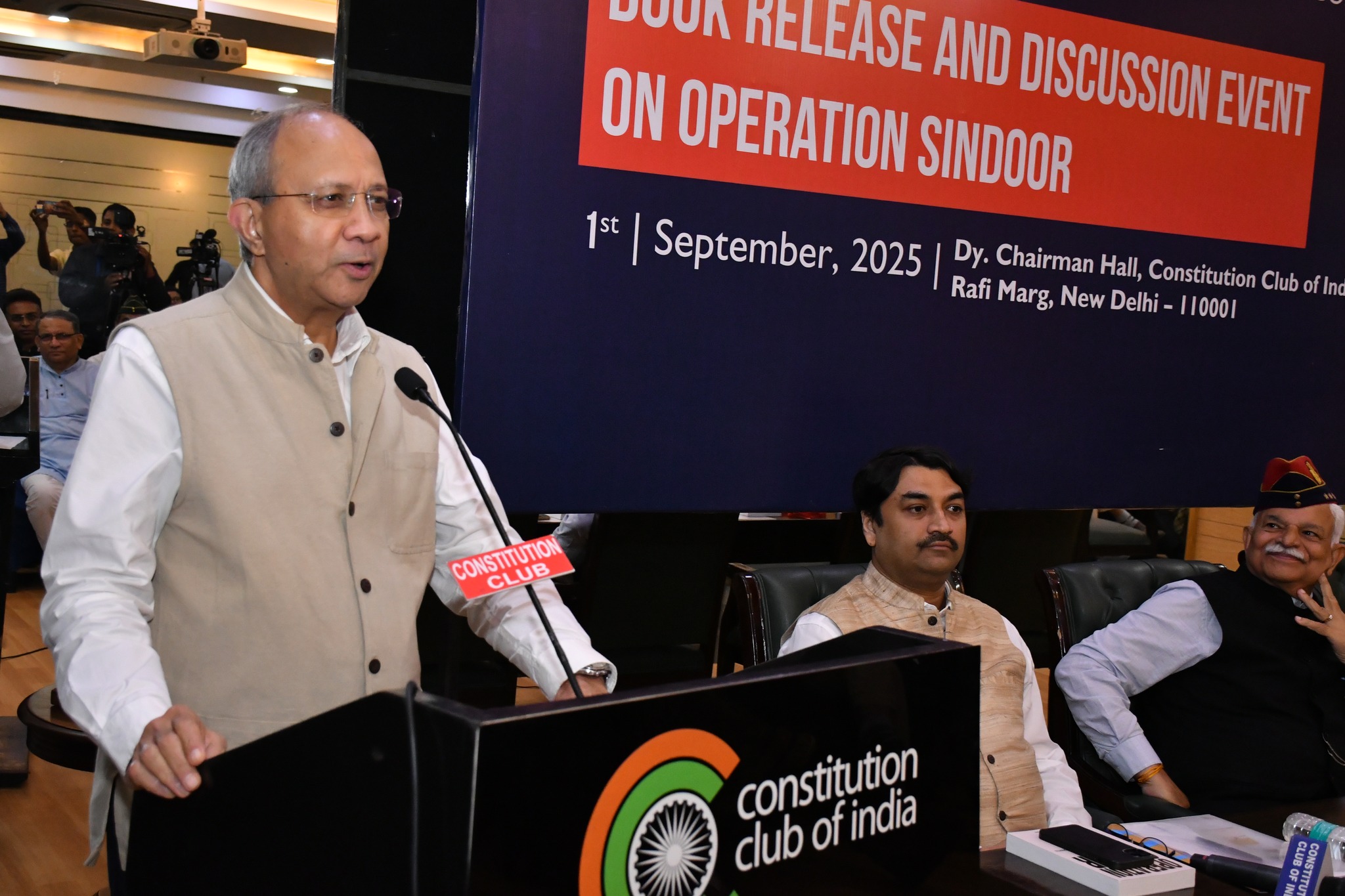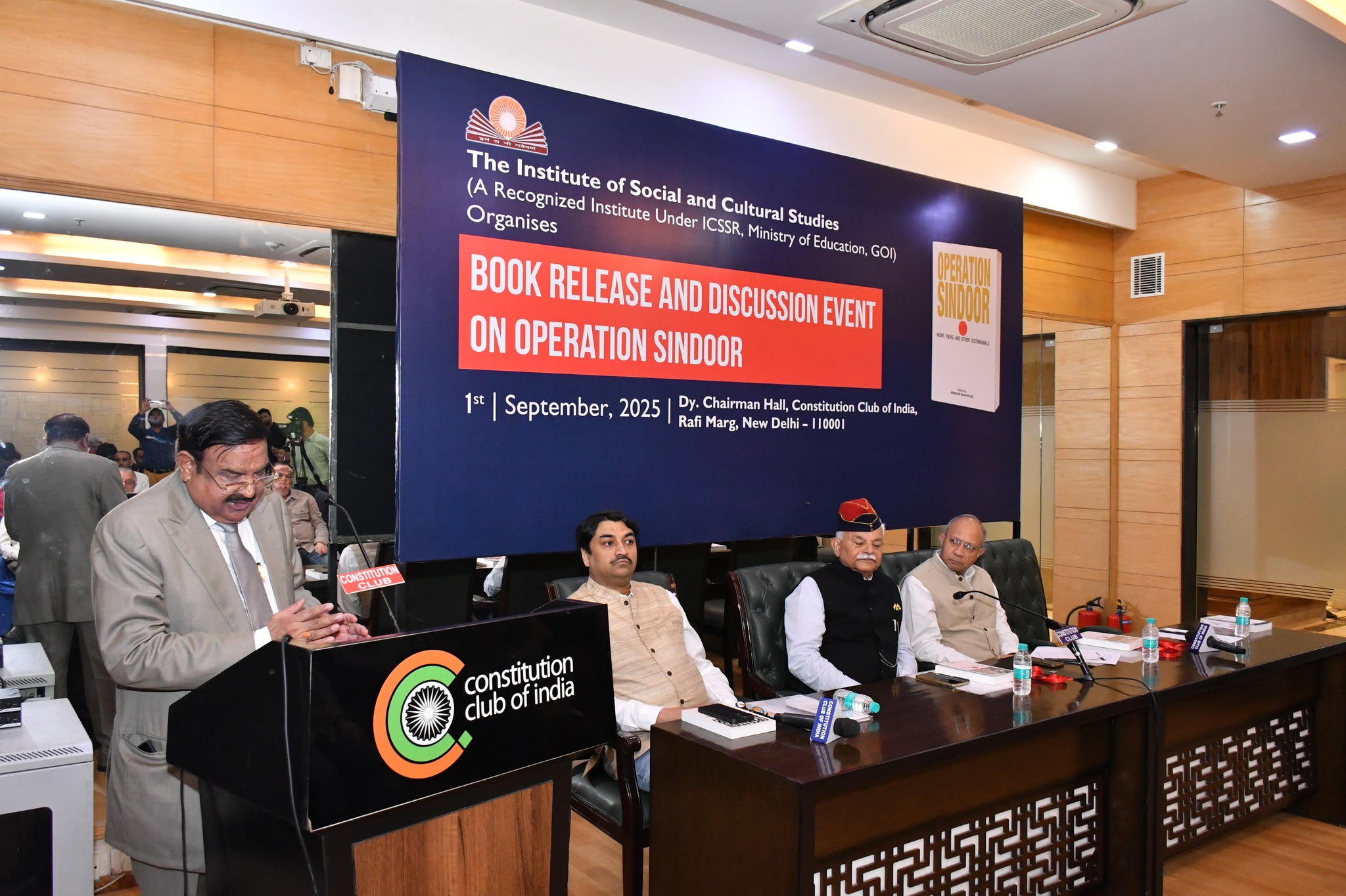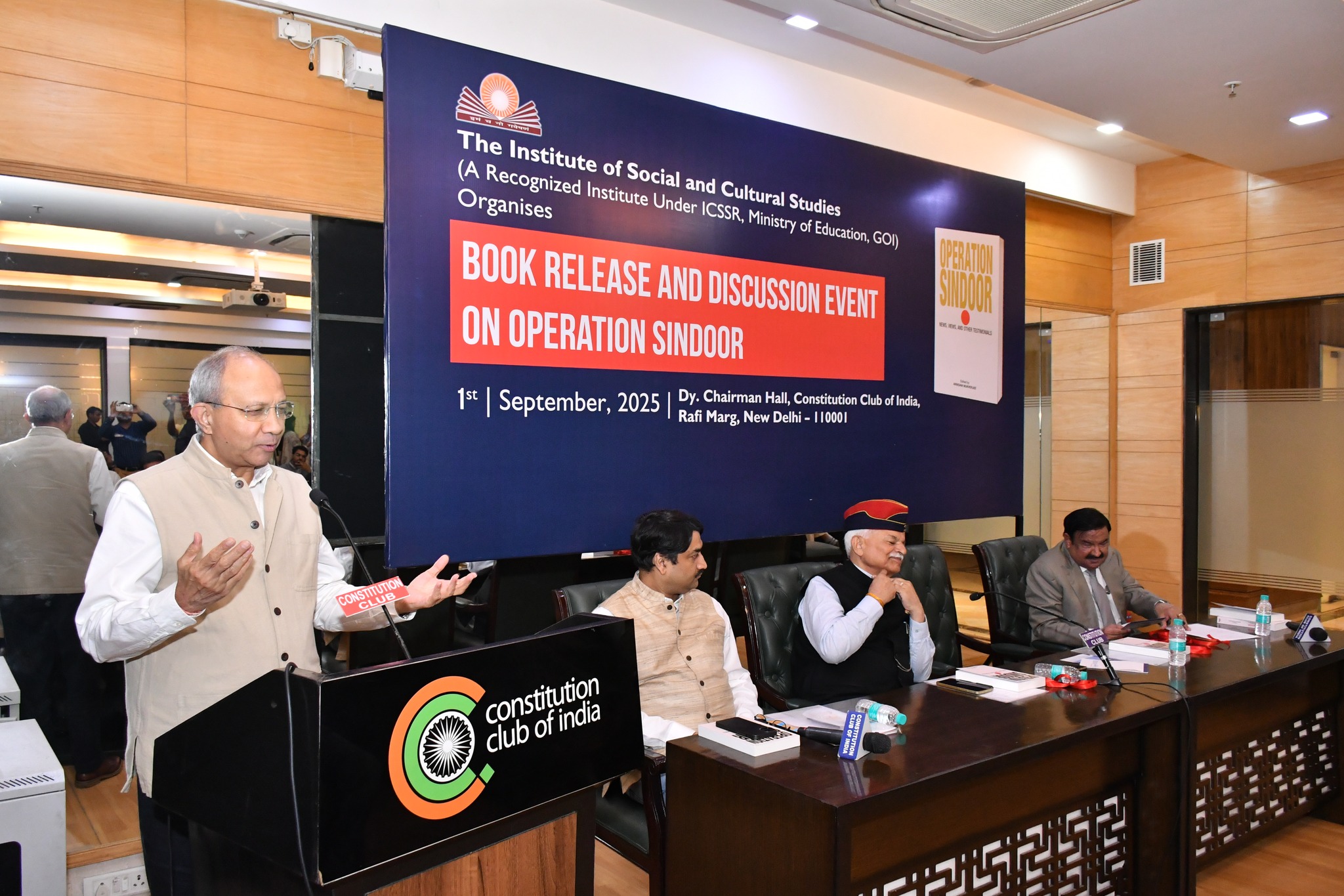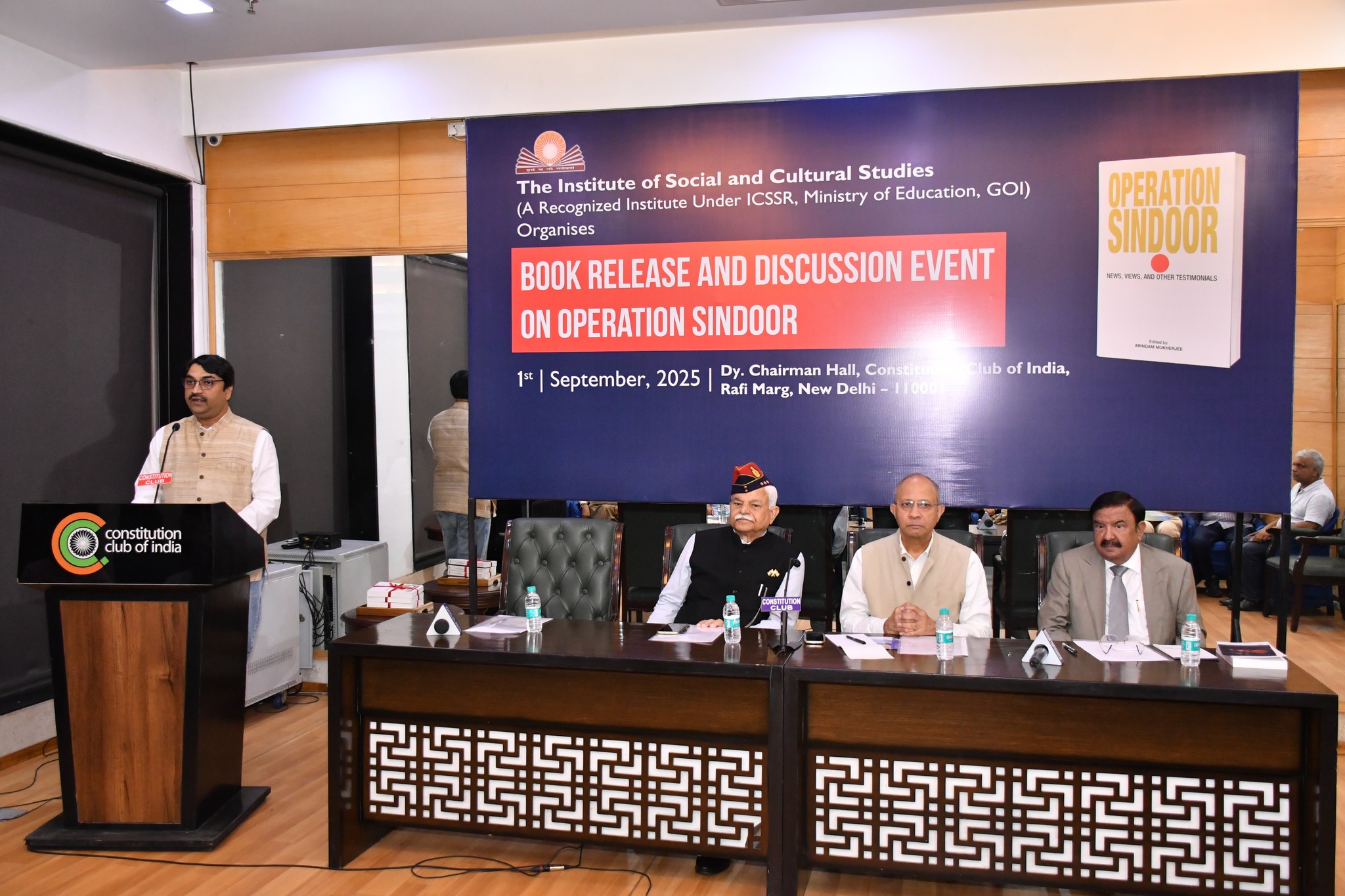 Book Launch and Discussion Event on Operation Sindoor at the Dy. Chairman Hall, Constitution Club of India, New Delhi, scheduled for September 1, 2025. The event was organized by ISCS. The book was released by Lieutenant General (Retd.) Shri Vishnu Chaturvedi, Shri Kulbir Krishan, IPS (Retd), a former member of the National Security Advisory Board (NSAB), India and Shri Pankaj Saran, the former Deputy National Security Advisor (DNSA) of India. The publication titled ‘Operation Sindoor: News, Views and other Testimonials’ is edited by Shri Arindam Mukherjee, the Director of ISCS.